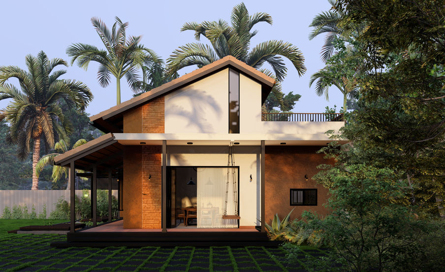 Set in Kodungallur, this single-storey home unfolds gently across 1,200 sqft. Clay roof tiles, exposed brick, and polished concrete make up the language of slow mornings and quiet evenings. A swing rests on the front veranda, catching breeze and time alike.